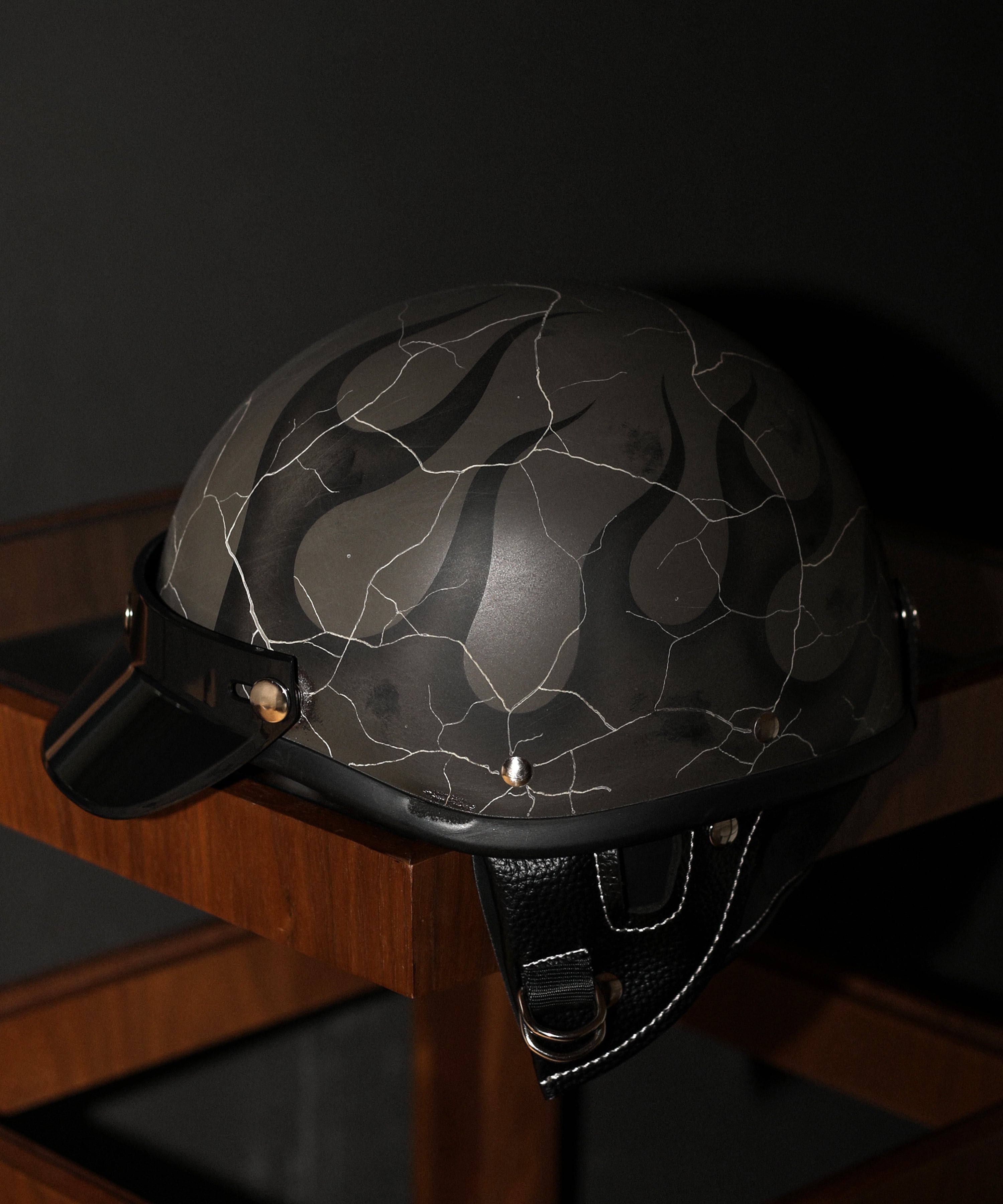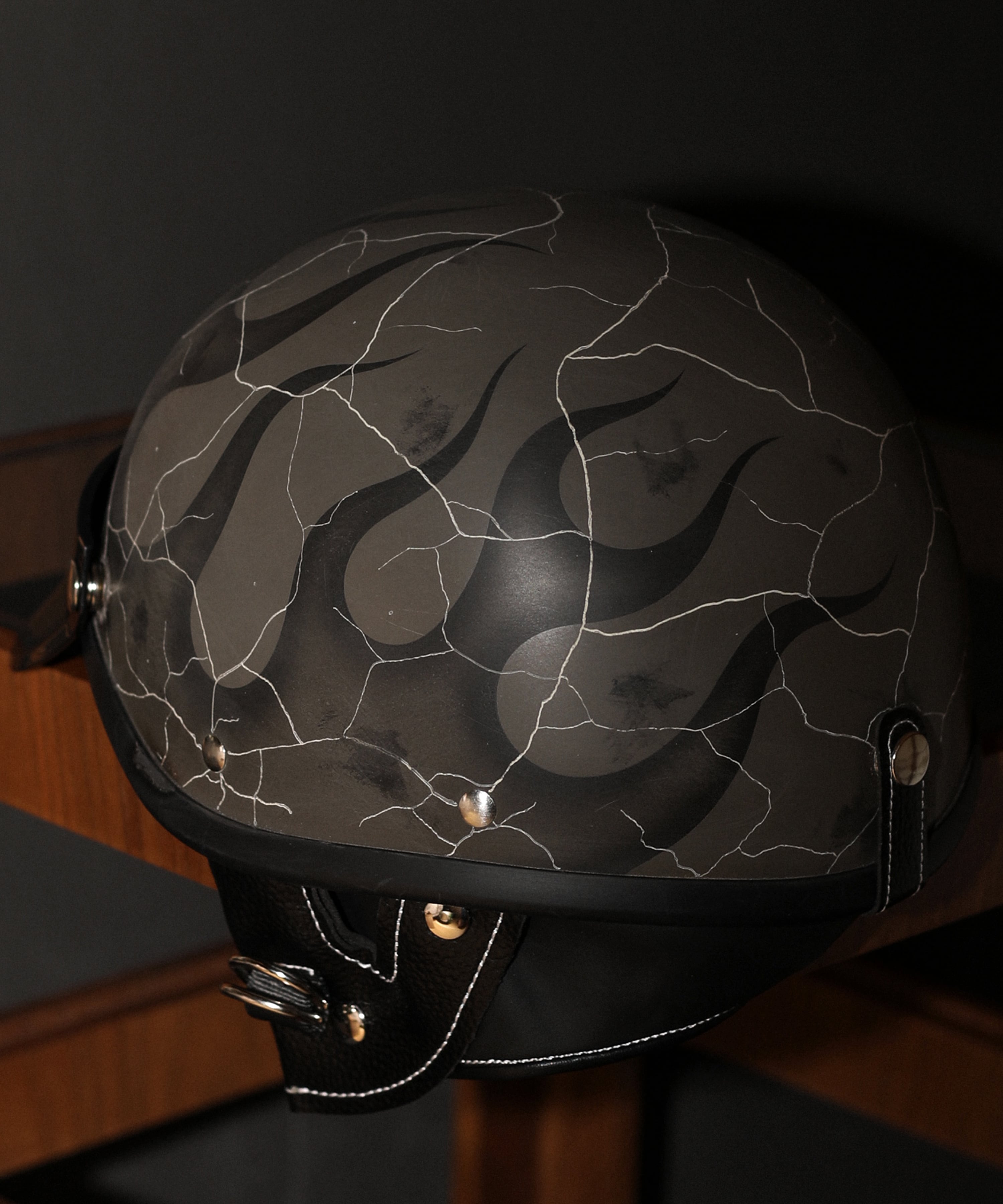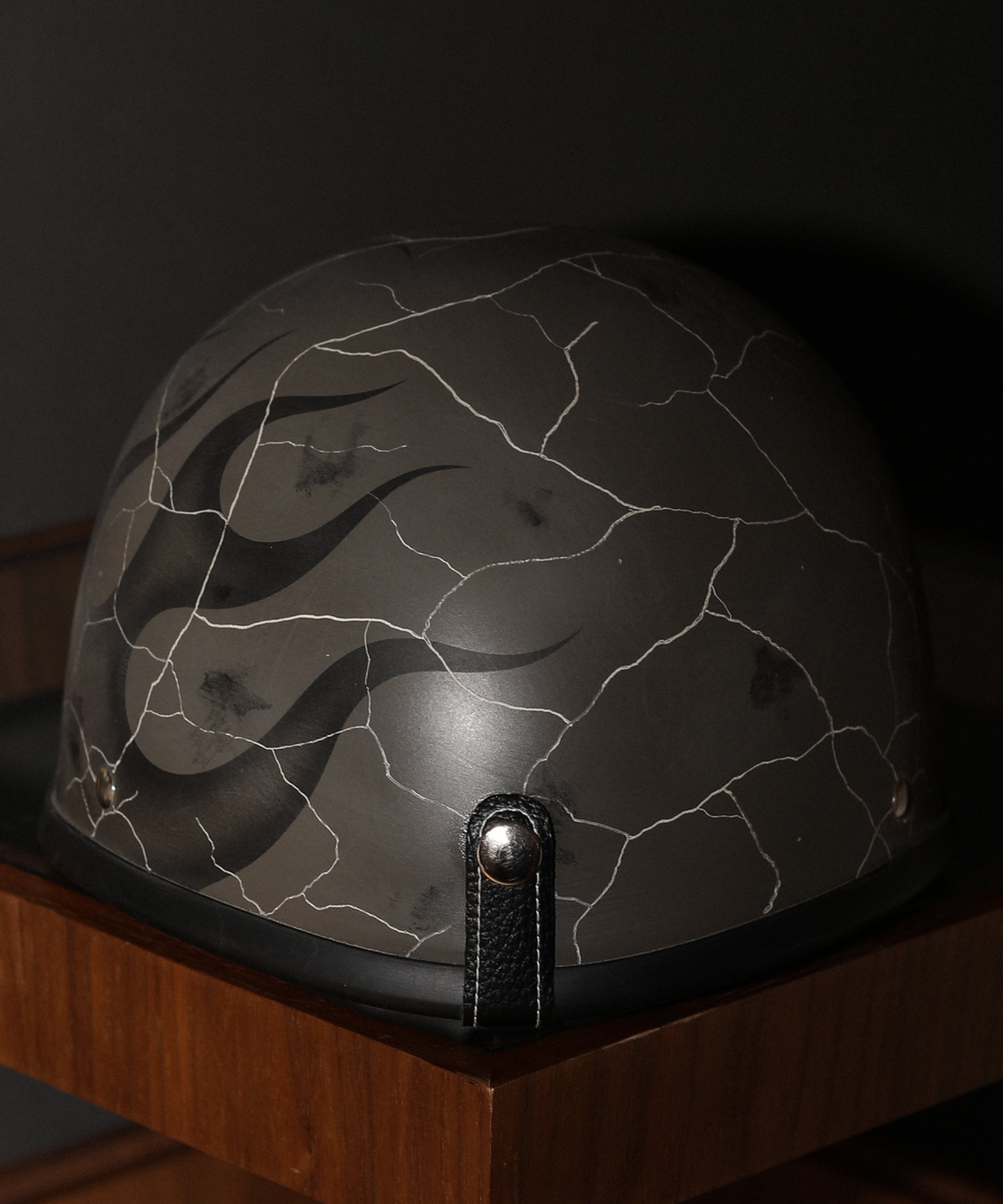今回はマッドブラックの帽体にて、一度帽体をカーキ色に染め上げた後陰影を使用しながらフレイムスを描き、フルクラックによるエイジング加工を施しています。